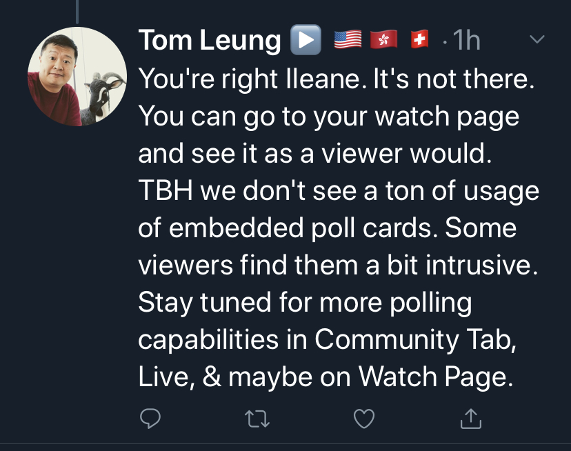 After answering the question, Tom volunteered some juicy information for a possible future roll-out of more interactive polls in the Community Tab (which already has polls – expect more functionality), on Live streams and maybe even on the watch pages of videos!